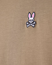 The MENS RUBBERIZED CROSSBODY - B6A635F200 from Psycho Bunny is a durable polyester black bag with "PSYCHO BUN" in raised letters on the strap. It displays a glossy skull and crossbones with bunny ears on the front, set against a plain white background.
