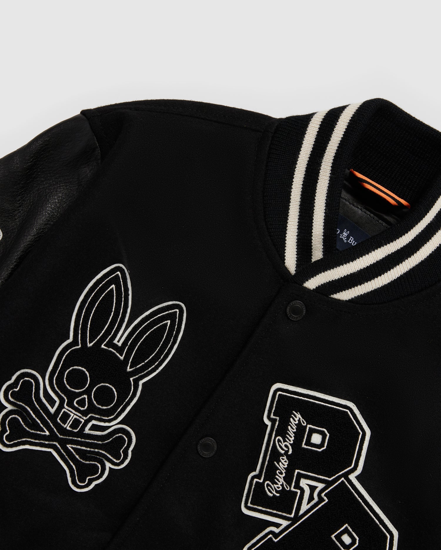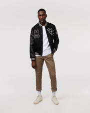 The fitted men's Robbins wool-blend and leather varsity jacket is covered in prep-inspired chenille and embroidered patches. Soft satin lining makes for comfortable wearability, while the shell's color scheme makes it easy to pair and the ultimate luxury varsity fashion style.